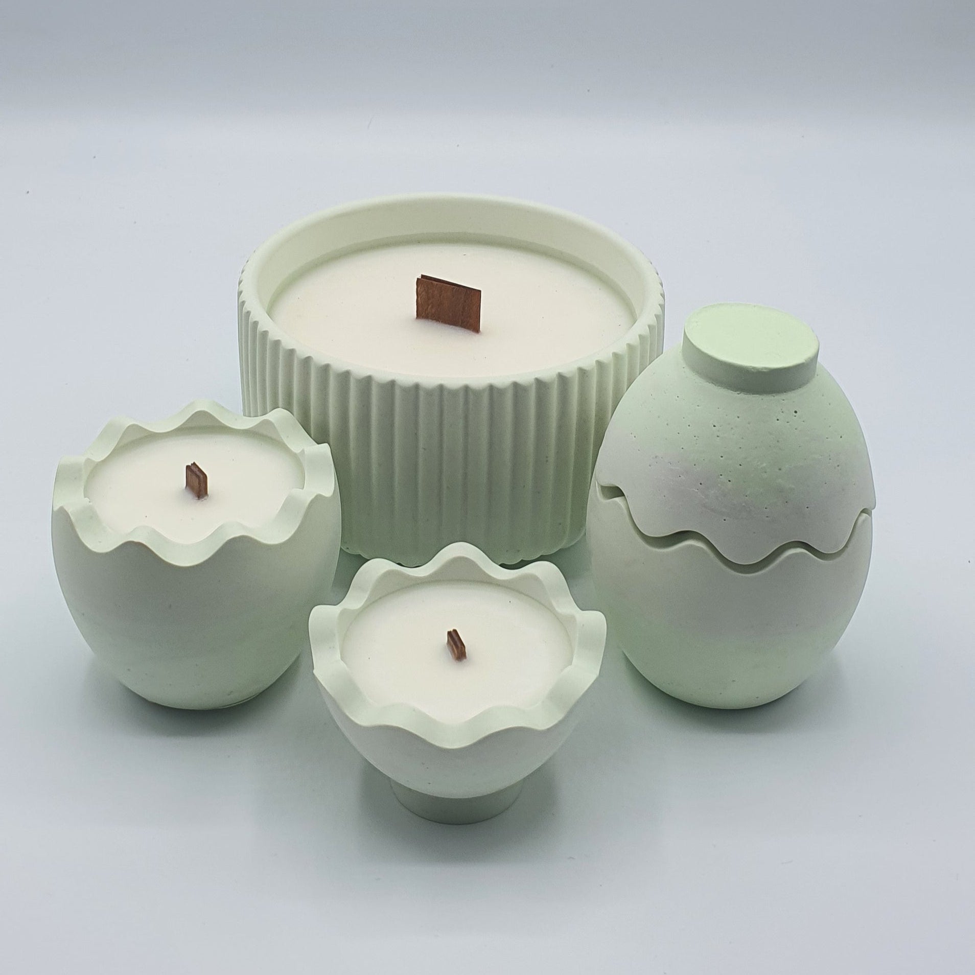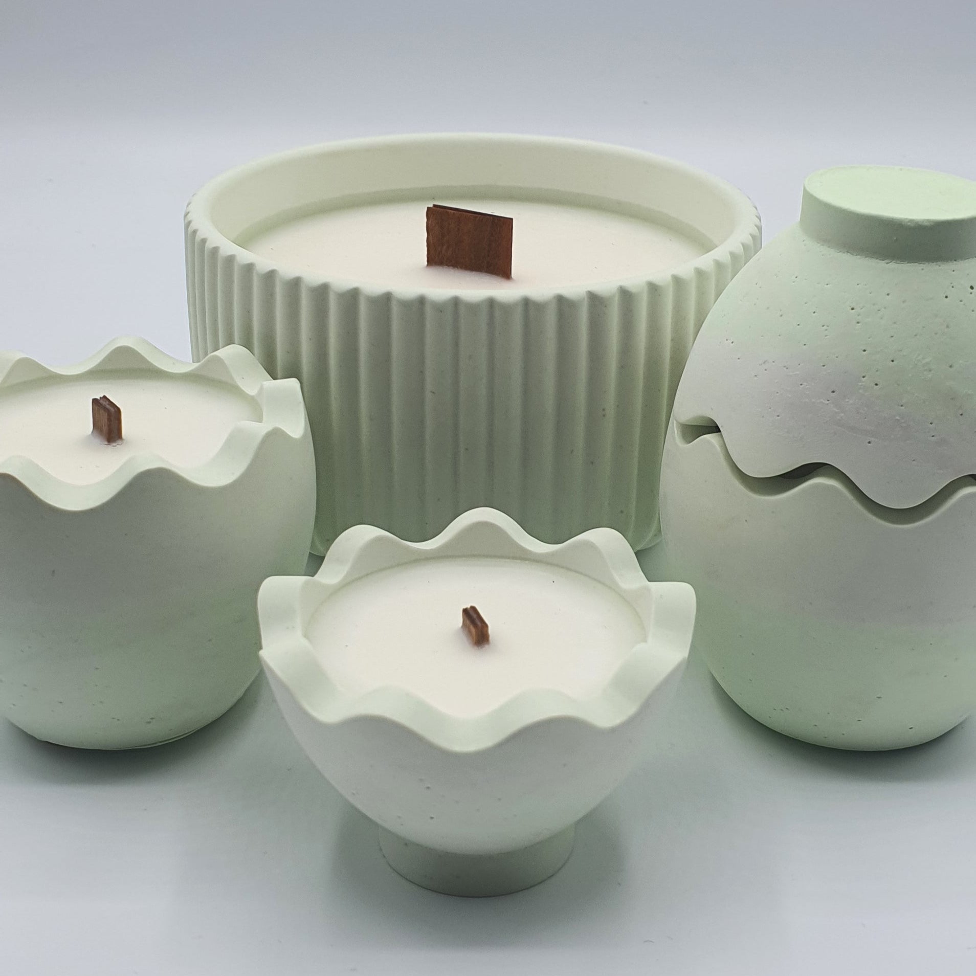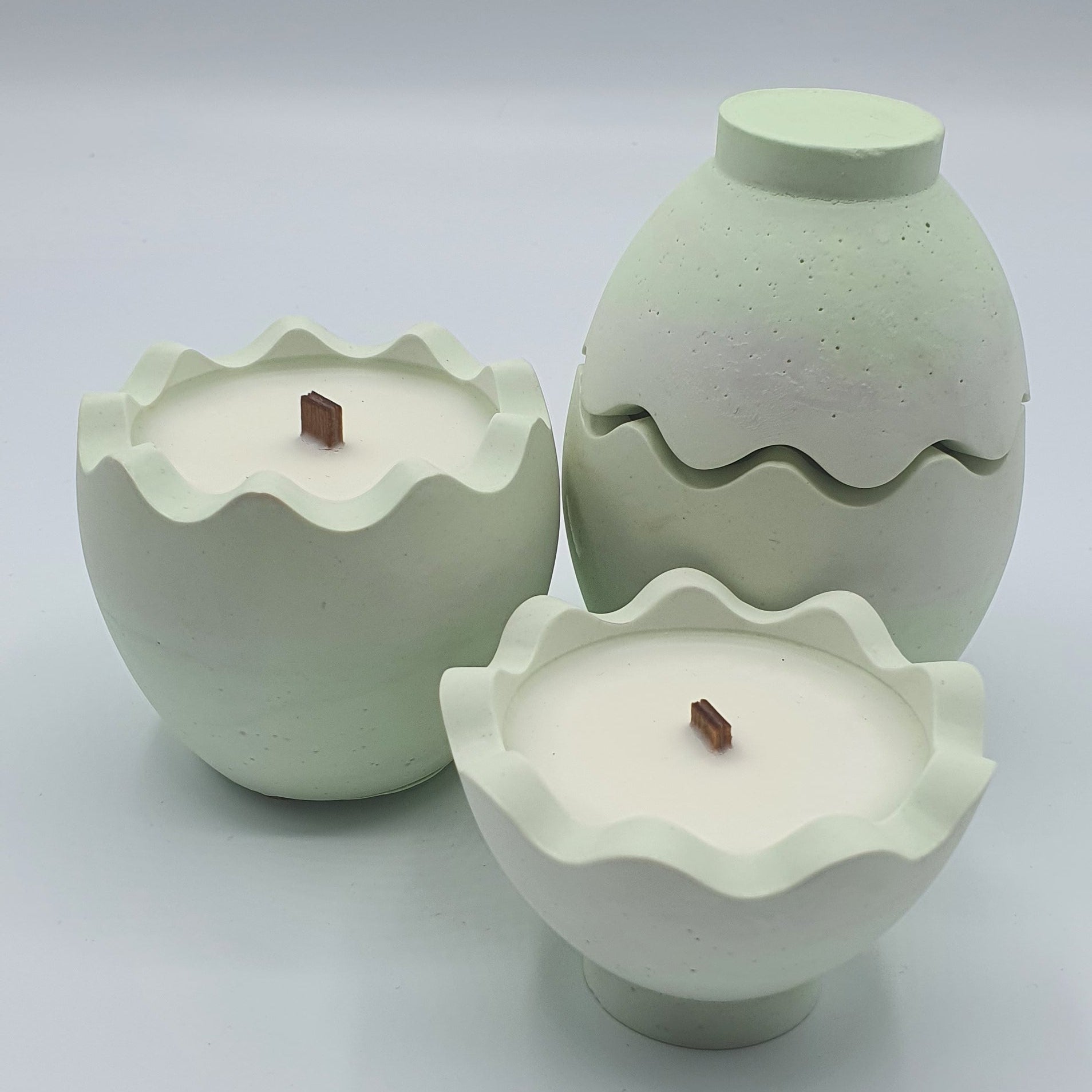 Turnată într-un vas verde pastel, în două nuanțe 🏺—diafan și gentil, ca o ținută proaspătă de podium—fiecare este realizat manual dintr-un material natural, netoxic, pe bază de calciu, unic.