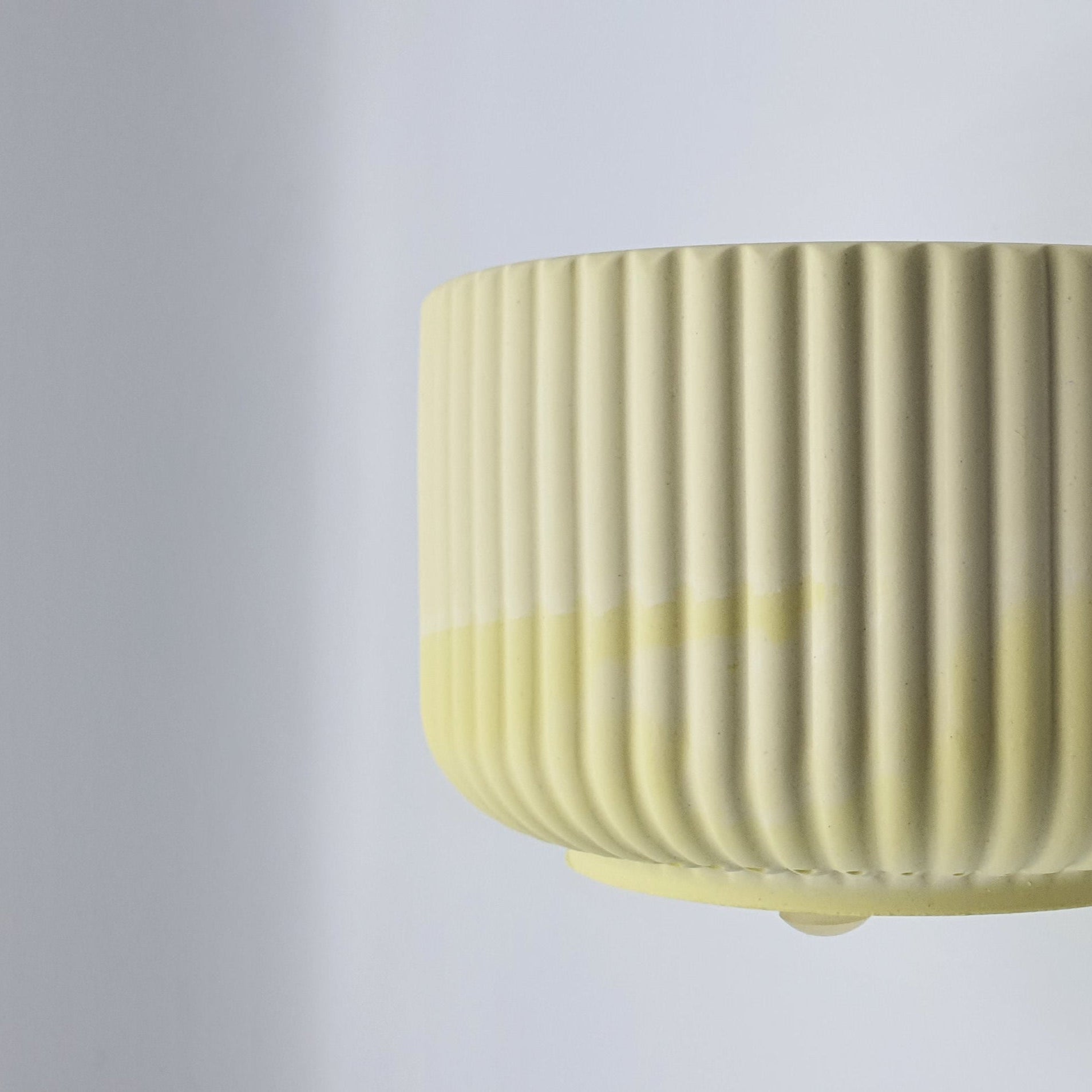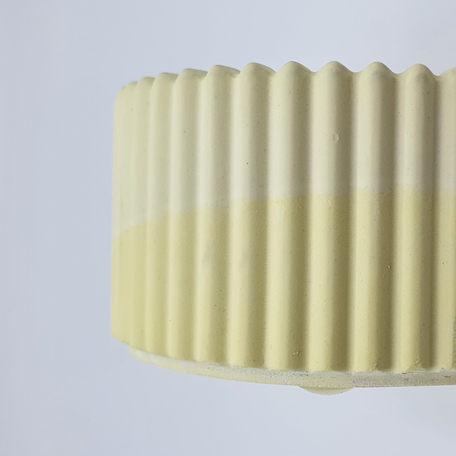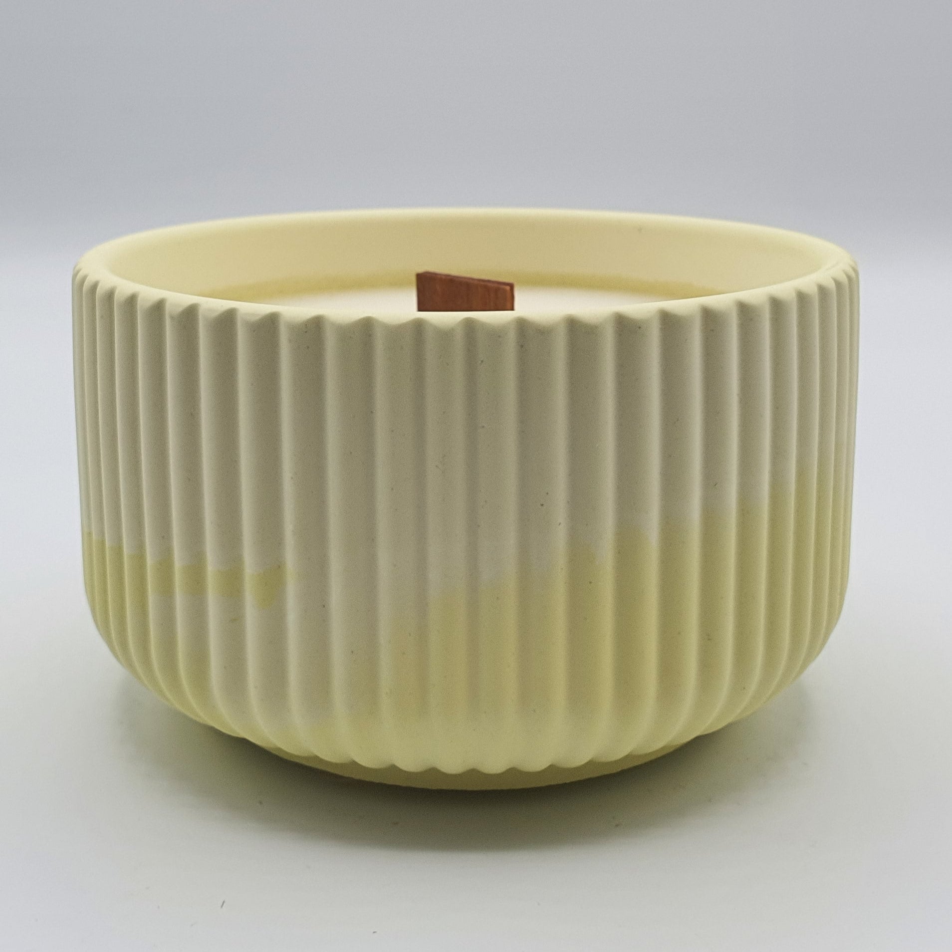 Turnată manual într-un vas pastel galben în două nuanțe 🏺—jumătate soft, jumătate vibrant—pentru că primăvara e un echilibru între soare și tandrețe. Fiecare recipient este realizat dintr-un material natural, netoxic, pe bază de calciu, și niciunul nu seamănă cu altul. ✨