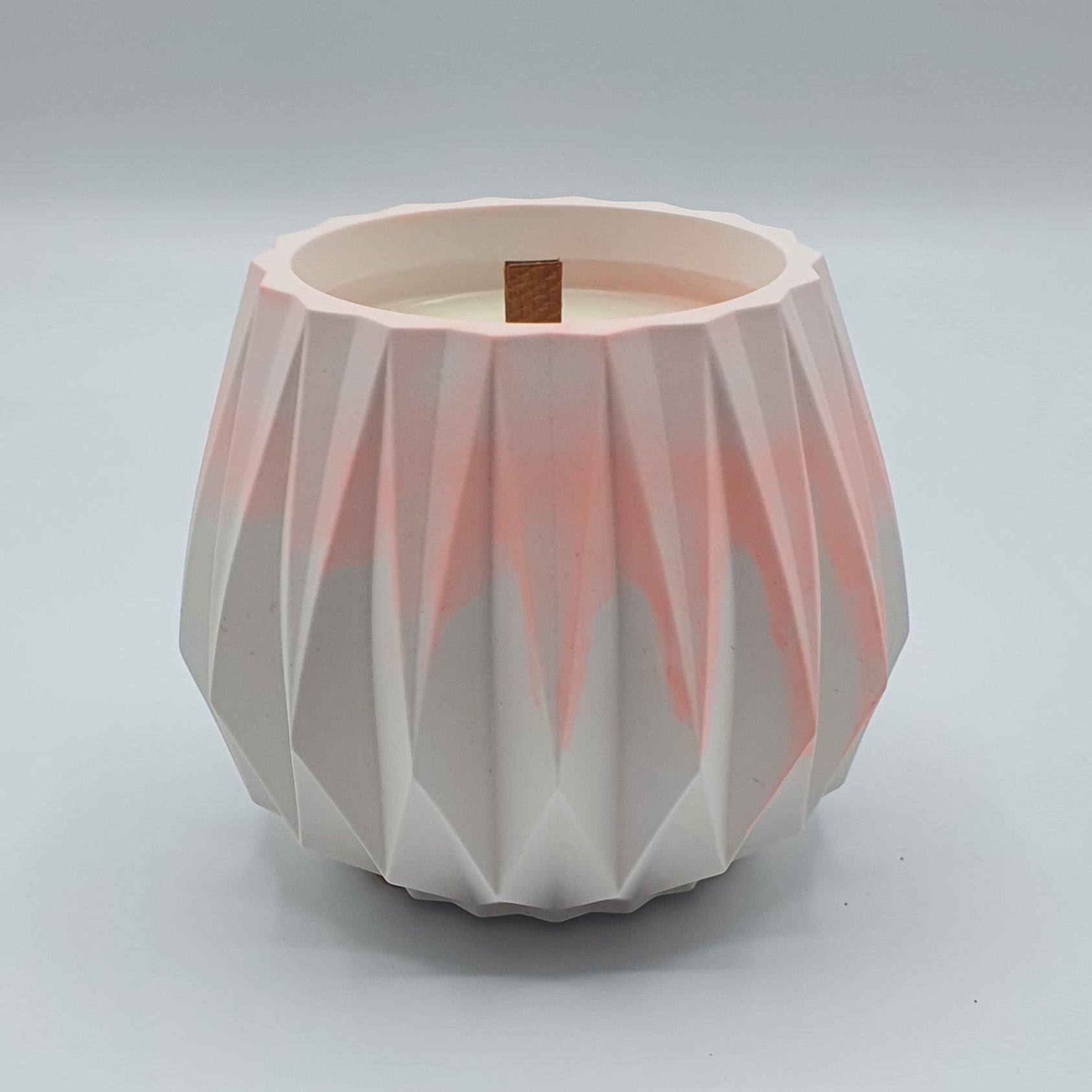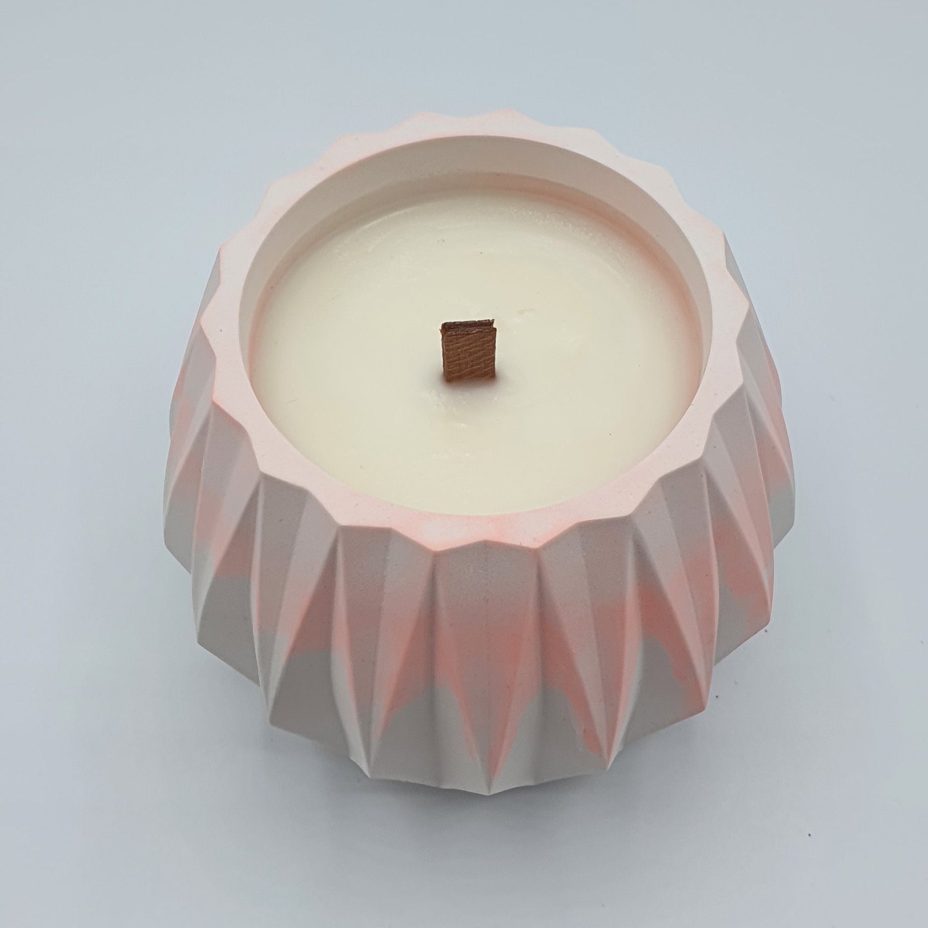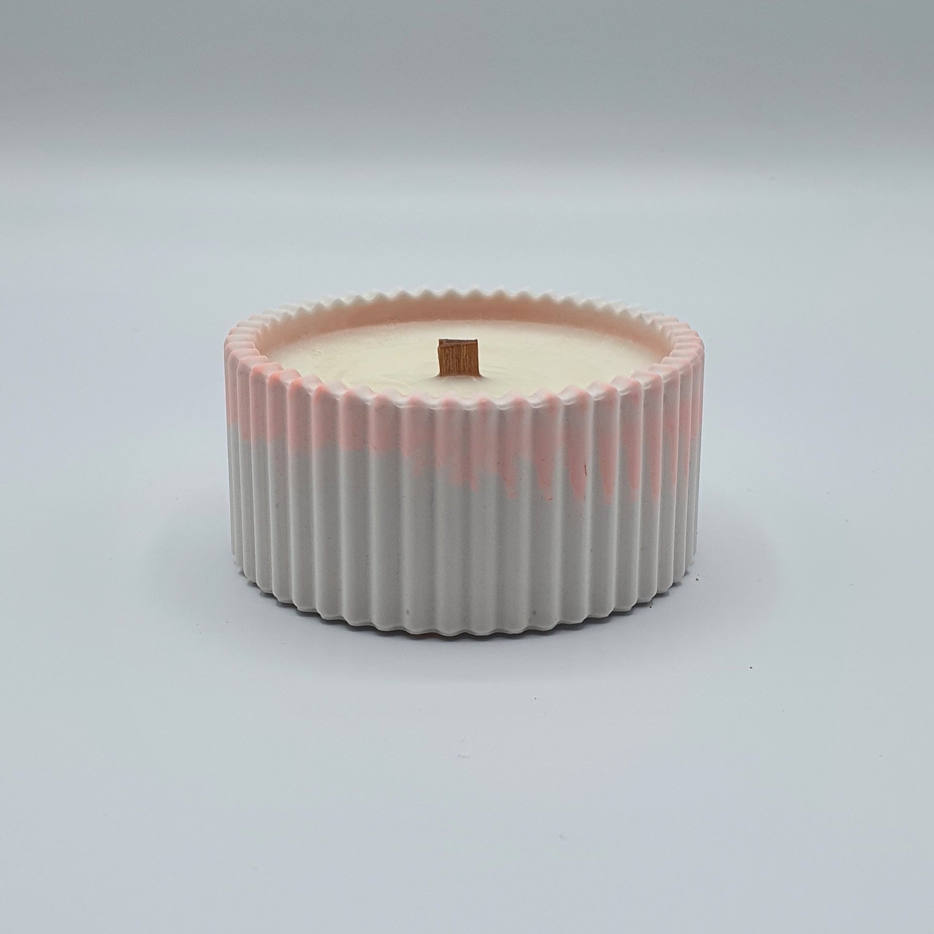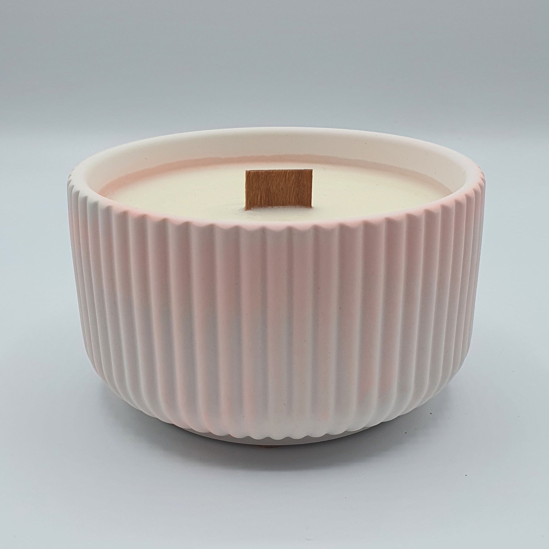 Turnată manual într-un vas jumătate roz intens, jumătate pastel roz 🏺, realizat dintr-un material natural, netoxic, pe bază de calciu — fiecare vas este amestecat de mână, pentru un aspect unic, artizanal.