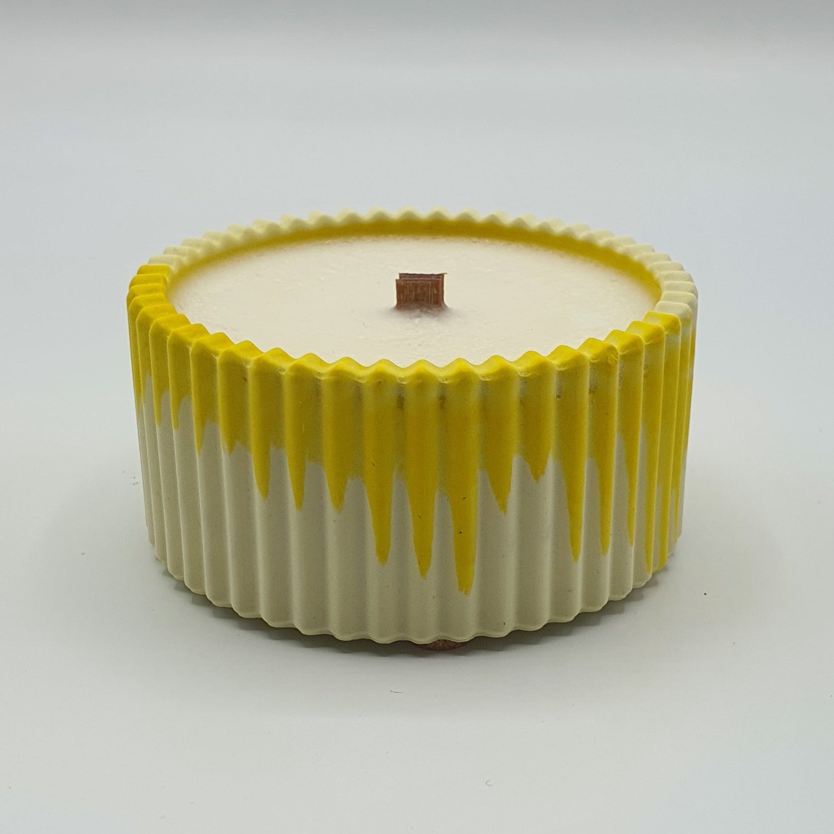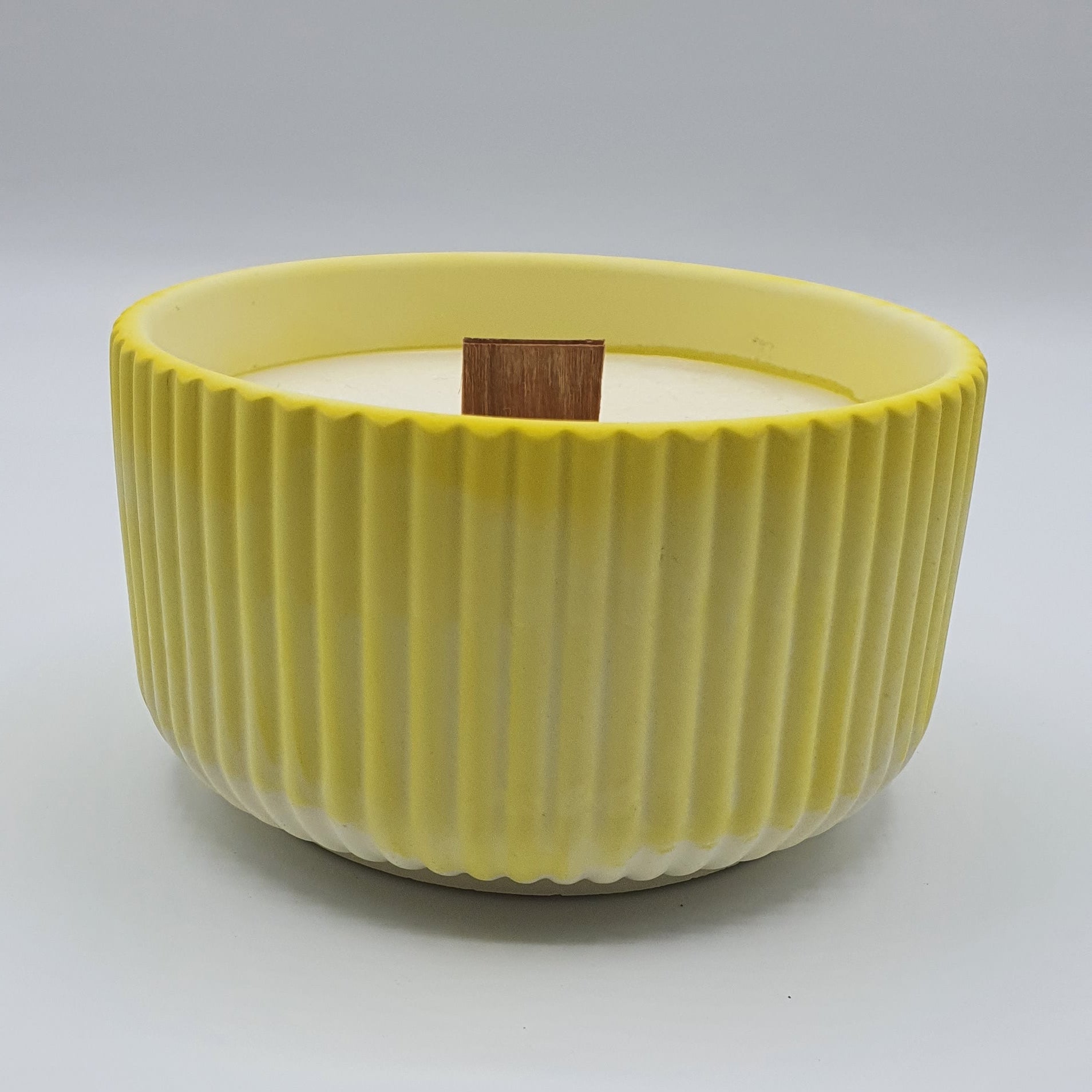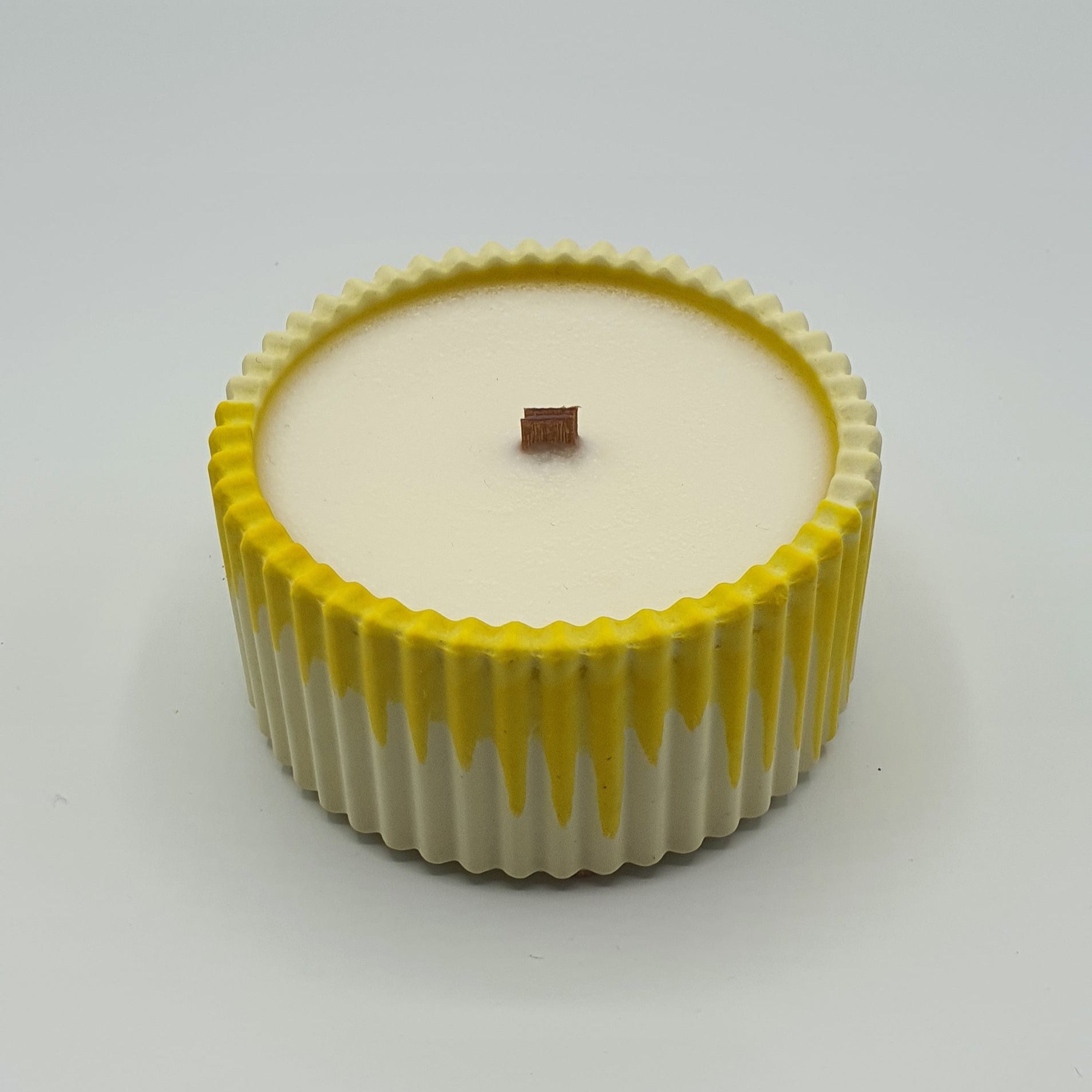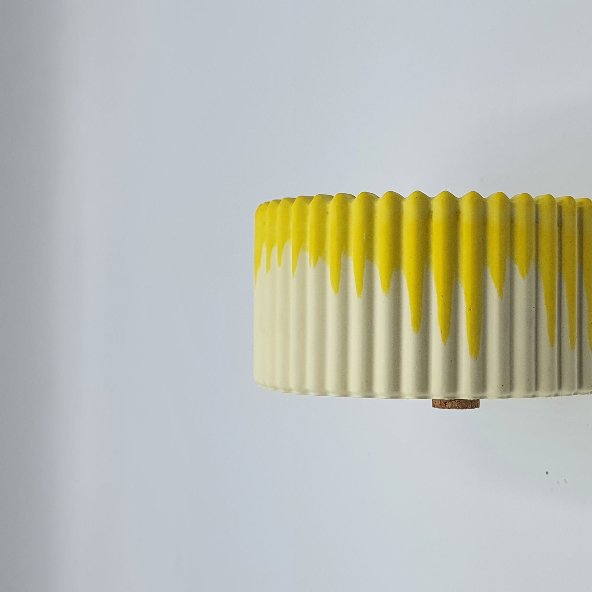 Turnată manual într-un vas jumătate galben aprins, jumătate pastel galben 🏺, dintr-un material natural, netoxic, pe bază de calciu — fiecare vas e unicat, amestecat manual, ca următoarea ta aventură.